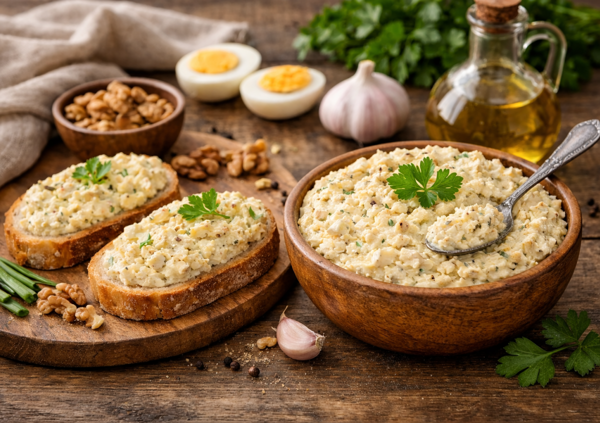 Яйца отвариваем вкрутую, лук обжариваем до мягкости и лёгкой золотистости — именно он даёт ту самую приятную сладость. Затем соединяем всё вместе: яйца, орехи, лук, немного чеснока, добавляем майонез, соль и перец.