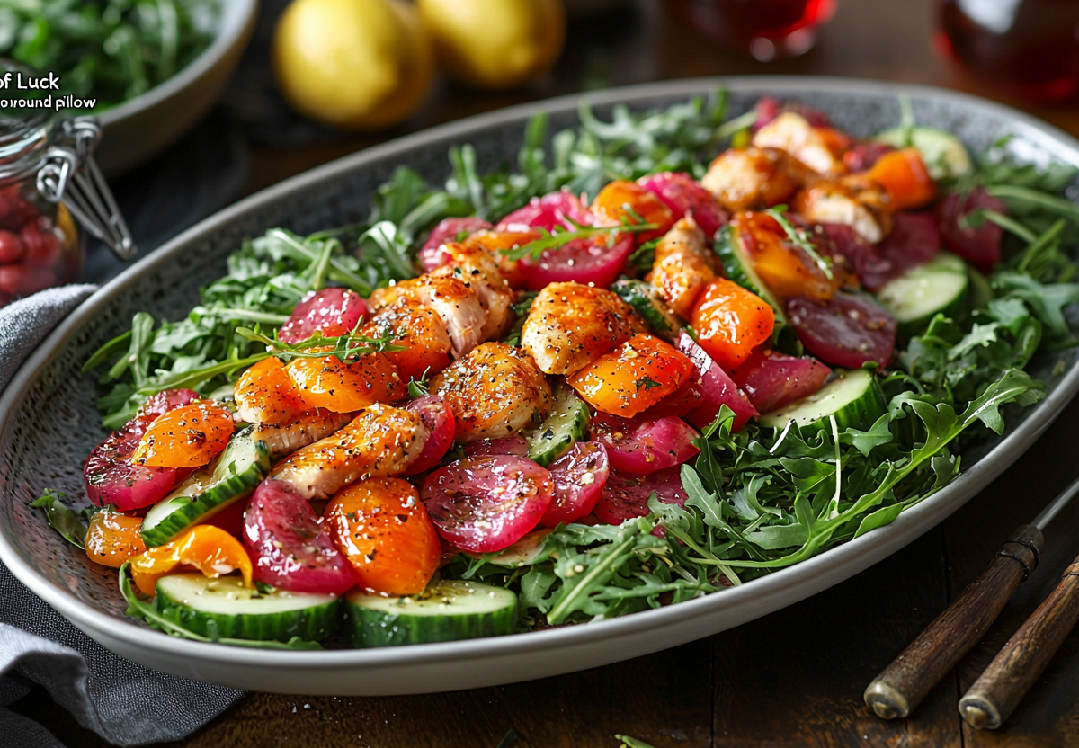 Возьмите 300 г копченой курицы, 2 огурца, 2 болгарских перца, банку красной фасоли, пучок руколы. Для заправки смешайте 3 ст. л. оливкового масла, 1 ст. л. лимонного сока, зубчик чеснока, соль и перец. Курицу нарежьте соломкой, огурцы и перец — тонкими полосками. Слейте жидкость с фасоли. На большое блюдо выложите подушку из руколы, затем аккуратно разложите все ингредиенты, создавая композицию, напоминающую седло. Полейте заправкой прямо перед подачей, чтобы сохранить хрусткость.