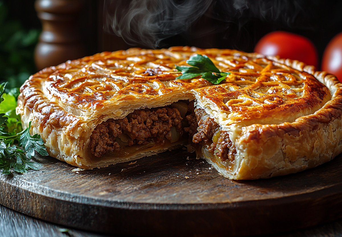 Тончайшее тесто скрывает внутри сочную ароматную начинку из говядины с луком. При надкусывании хрустящая корочка ломается, выпуская фонтан горячего мясного сока — это и есть идеал.