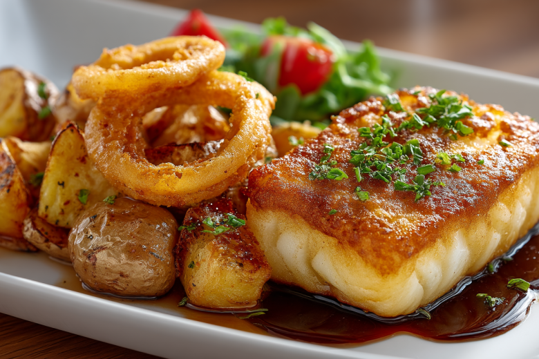 Филе белой рыбы (треска, судак) — 600 г, картофель — 4-5 шт. (средние), репчатый лук — 3-4 крупные головки, мука — 5-6 ст. л., растительное масло для жарки и фритюра — 300–400 мл, соль, черный перец (свежемолотый) — по вкусу, свежая зелень для подачи.
