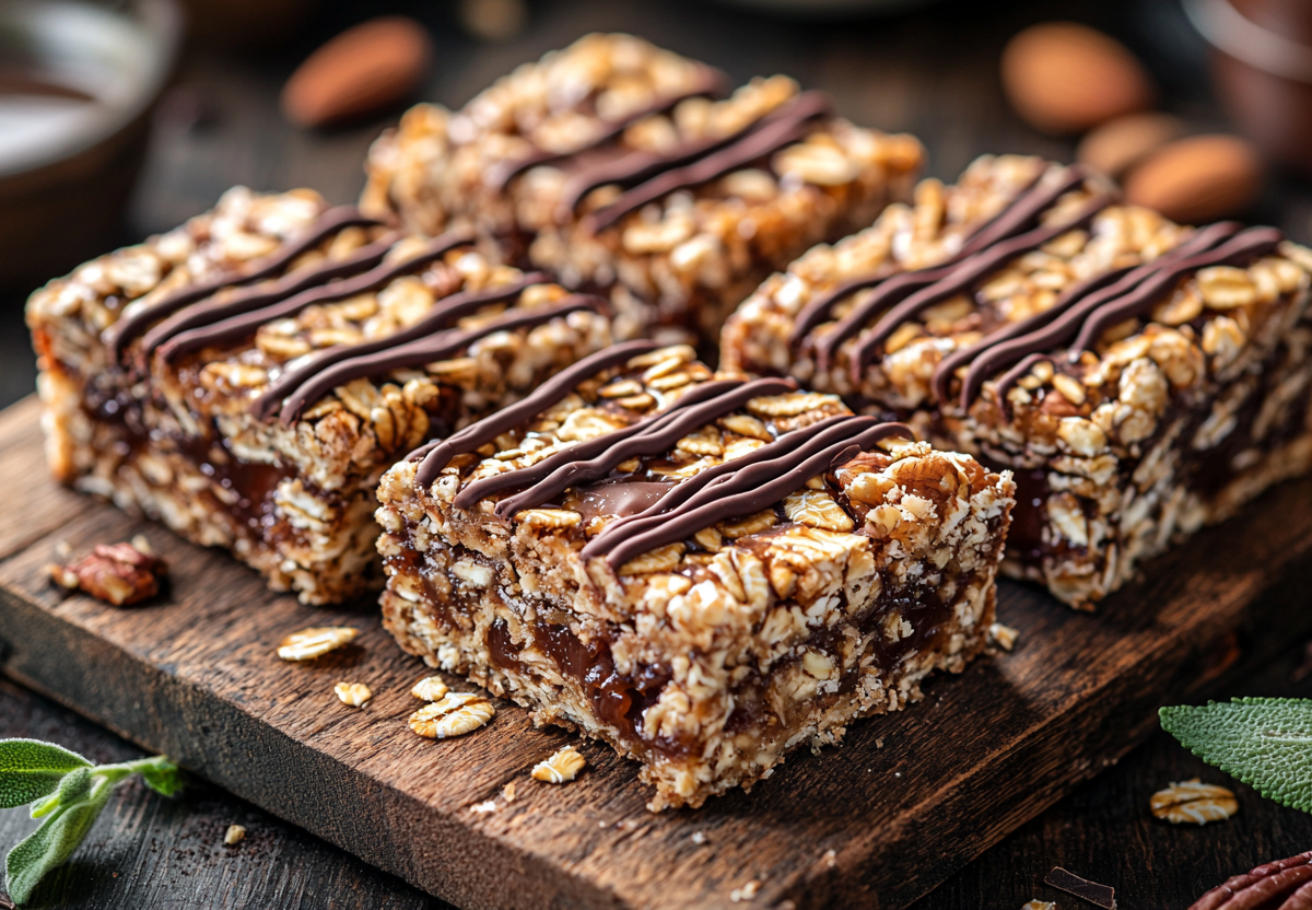 Для приготовления смешайте по 1 стакану овсяных хлопьев долгой и быстрой варки, добавьте 1 ч. л. корицы, 1/3 ч. л. имбиря и 2–3 ч. л. какао. Растопите 50 г сливочного масла с 5 ст. л. меда или сахара, соедините с сухими ингредиентами. Вбейте 1 яйцо, добавьте орехи или сухофрукты по вкусу и оставьте на 5 минут. Выпекайте при 160°C 20–25 минут, затем нарежьте и украсьте растопленным шоколадом.
