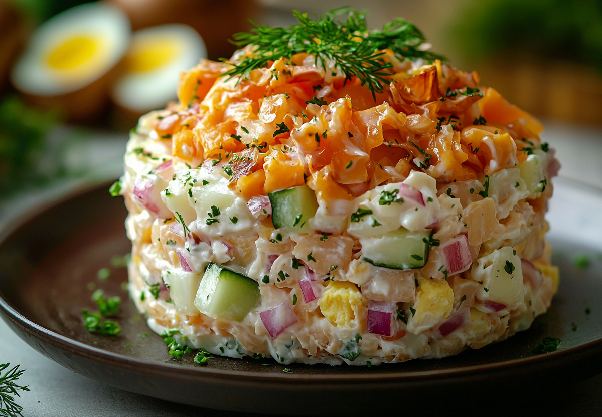 Блюдо покоряет с первой ложки: обжаренные до золотистости лисички или белые грибы дают глубокий лесной вкус, который подчеркивают слои сочного куриного филе, хрустящих огурцов и сливочного сыра.