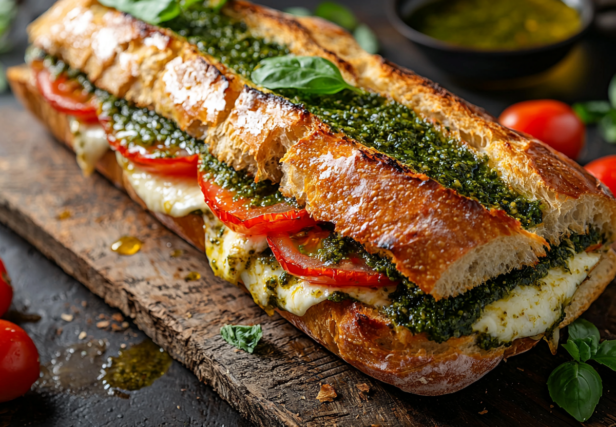 Забудьте о скучных бутербродах! Этот багет с песто и моцареллой удивит вас! Это простой и вкусный способ разнообразить обычный обед или перекус. Сочетание мягкой моцареллы, свежих томатов, ароматных трав и пряного итальянского песто создаёт насыщенный и приятный вкус, который точно понравится всем. Запекается быстро, а результат всегда радует глаз и вкус.