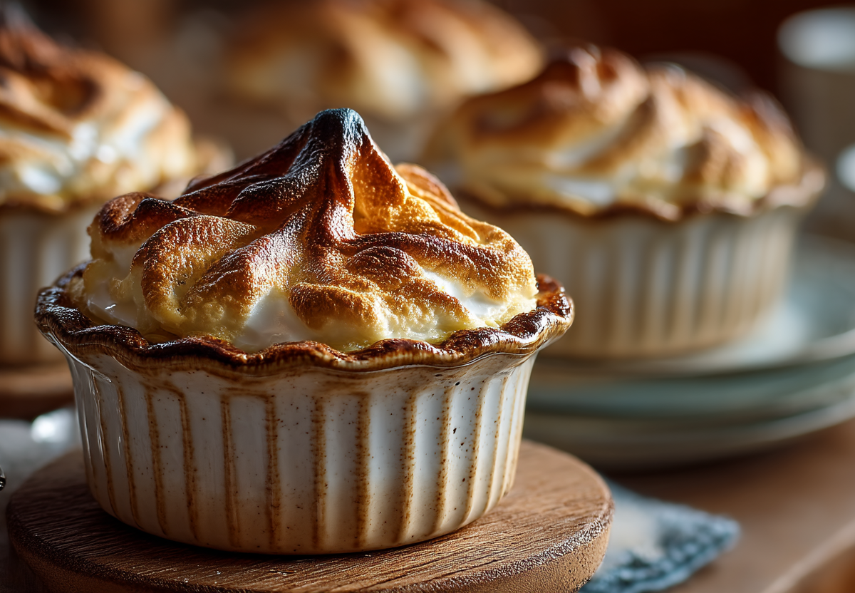 400 г творога тщательно разминаю вилкой или пробиваю блендером до гладкой пастообразной консистенции. Добавляю столовую ложку сахара, щепотку ванилина и столовую ложку муки, перемешиваю до однородности. Творожную массу раскладываю по 4–6 порционным формочкам или керамическим кокотницам, распределяя по дну и слегка приподнимая края, а в центре формирую пальцем аккуратное углубление. В каждое углубление выкладываю по полной ложке готового заварного крема или густого ванильного пудинга. 2 охлажденных белка взбиваю миксером на средней скорости, постепенно добавляя 4 столовые ложки сахара, до устойчивых, глянцевых пиков. Взбитое безе аккуратно распределяю поверх крема, полностью закрывая начинку и формируя высокие живописные шапки, слегка выходящие за края формочек. Ставлю формочки на противень и отправляю в разогретую до 160 °C духовку на 25–30 минут, пока безе не станет золотисто-кремовым и не покроется тонкой хрустящей корочкой. Даю десерту немного остыть — внутри они будут очень горячими. Подаю чуть теплыми.