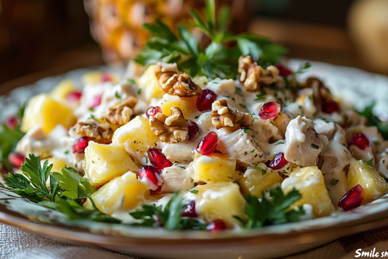 Этот салат действительно дарит улыбку своими неожиданными и удачными сочетаниями. Сочная курица, сладкие кусочки ананаса, пикантный сыр и сытный картофель создают удивительно гармоничную композицию, а хрустящие грецкие орехи добавляют приятную фактуру. Это идеальная легкая и праздничная альтернатива привычным, более тяжелым салатам.