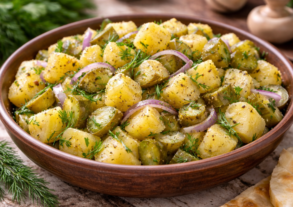 Этот салат узнают с первой ложки — простой, теплый и по-настоящему домашний. Его готовили еще по старым тетрадям, и до сих пор он собирает всех за столом быстрее любых деликатесов. Вкус детства, уюта и настоящей кухни без лишних украшений. Горячий картофель, хрустящие маринованные огурцы и ароматный укроп создают тот самый баланс, который невозможно повторить в модных салатах. Пока он теплый — особенно вкусный и насыщенный, а после остывания становится мягким и нежным.