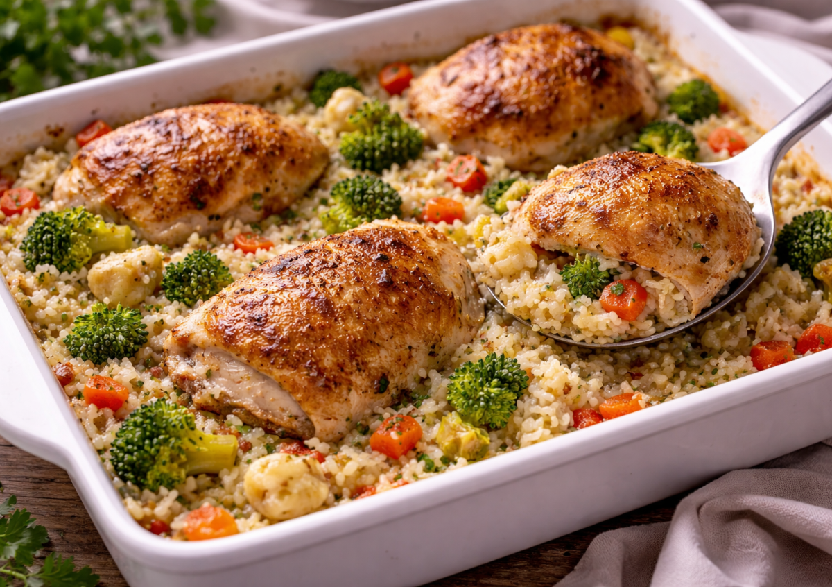 Когда нет ни сил, ни времени долго возиться на кухне, этот рецепт выручает меня постоянно. Подготовка занимает буквально 8 минут, а дальше духовка делает все сама. Курица получается сочная, рис — нежный и пропитанный сливочным соусом, а овощи добавляют вкуса и пользы. Все готовится в одной форме — меньше посуды, больше удовольствия.