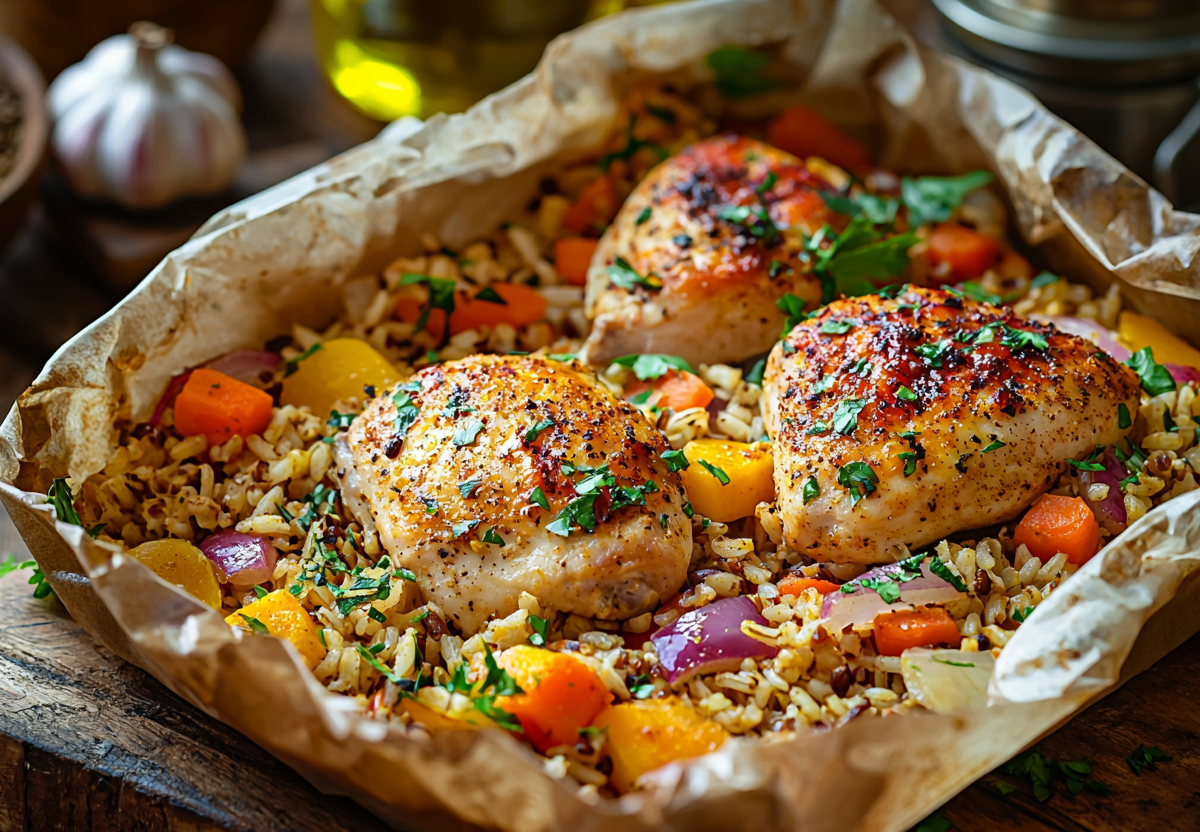 - В рукав выложите слоями: овощи → курица → рис → чеснок. Добавьте специи и масло, запекайте 40 мин при 180°C.