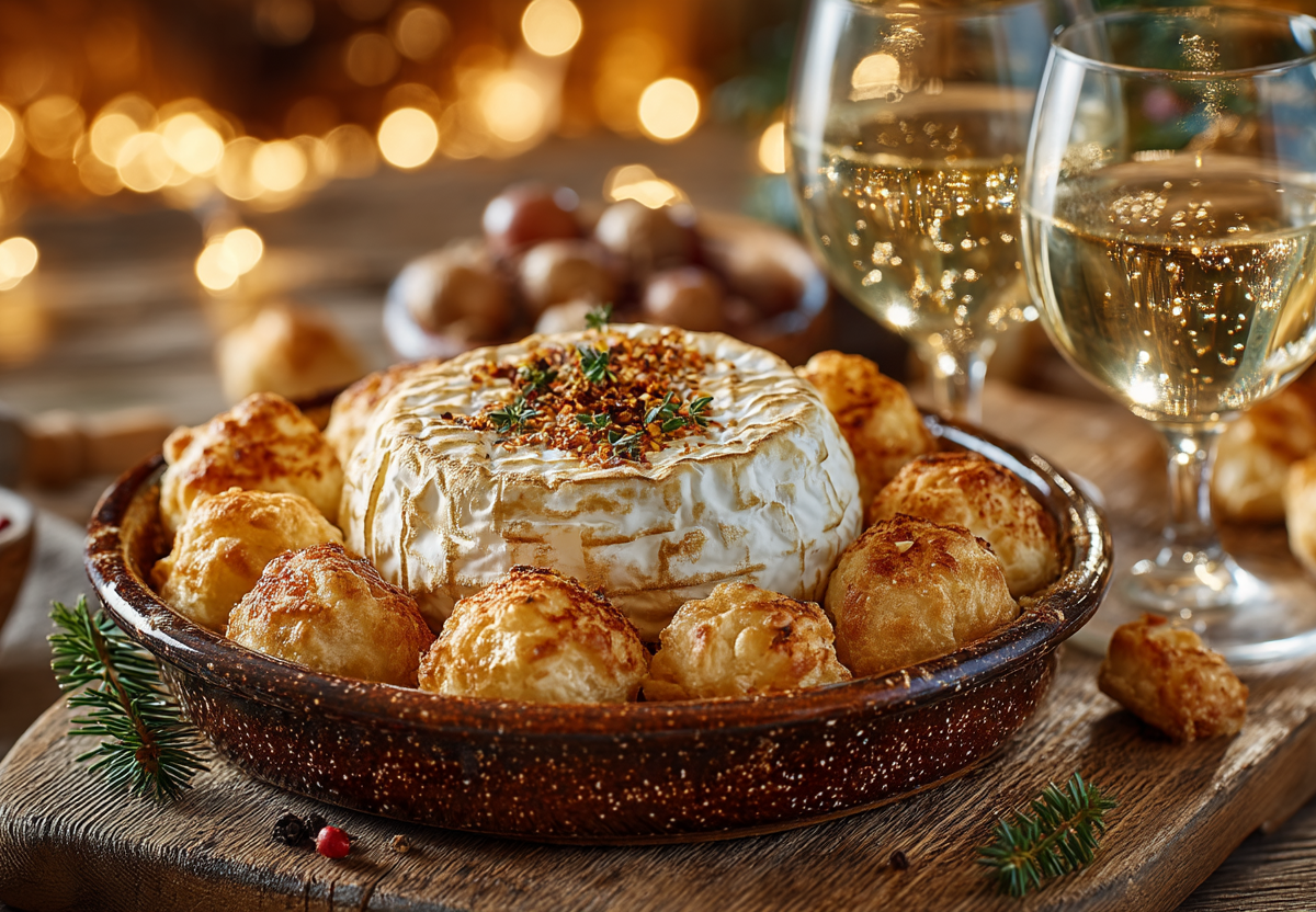 Слоеное тесто разморозьте, нарежьте на квадратики со стороной 5–6 см. В центр каждого квадратика положите шарик моцареллы, соберите края теста к центру и плотно защипните, формируя мешочек. У камамбера снимите упаковку и бумажную обертку, положите его в центр противня. Сделайте в сыре сверху несколько надрезов, вставьте в них тонкие пластинки чеснока, посыпьте специями. Вокруг камамбера разложите слоеные шарики. Смажьте шарики взбитым яйцом. Запекайте в разогретой до 200 °C духовке 15–20 минут до золотистого цвета теста. Подавайте закуску горячей.