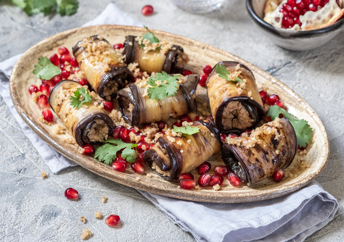 Орехи рубим ножом, смешиваем с мелко порезанной петрушкой, измельченным чесноком и черным перцем. Добавляем сметану и уксус, тщательно перемешиваем и тонким слоем выкладываем начинку на язычки баклажанов. Сворачиваем их рулетами и закрепляем зубочистками или шпажками для канапе. Выкладываем на сервировочное блюдо и посыпаем зернами граната и свежей зеленью.