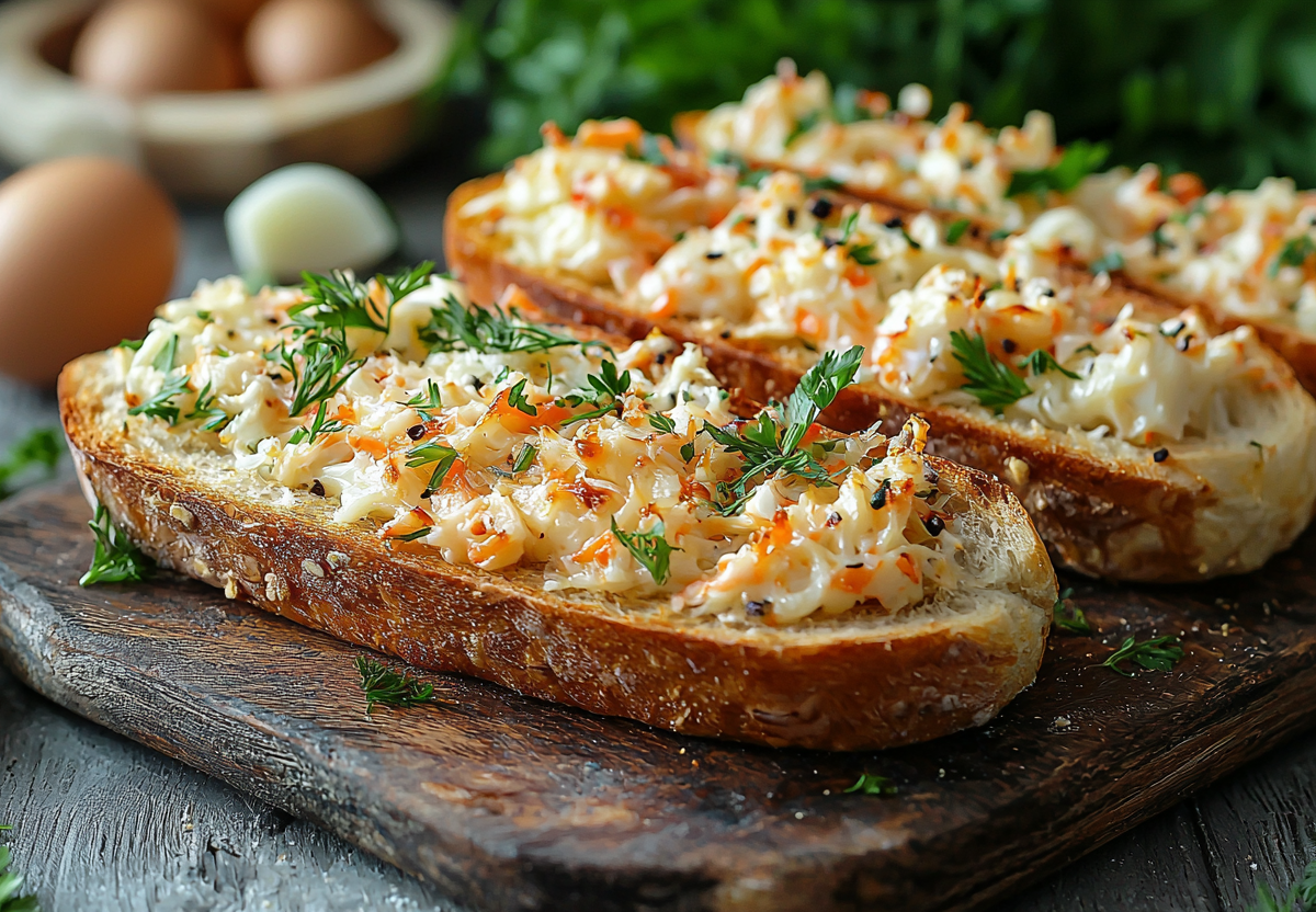 Запеченные бутерброды с крабовыми палочками «Снежный краб»! Это шедевр — пробуйте обязательно. Эта простая, но эффектная закуска станет настоящим украшением вашего стола! Нежные крабовые палочки, сливочный сыр и чесночный соус на хрустящем багете — идеальное сочетание вкусов и текстур.