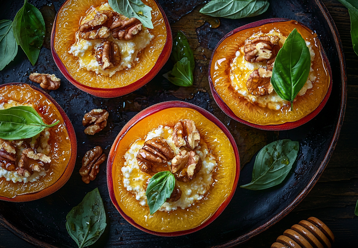 Запечённые нектарины с творогом! Хочется есть на завтрак, обед и ужин! Летний десерт, который покорит вас нежным сочетанием сладких фруктов, воздушной начинки и пряных ноток базилика. Это лакомство выглядит эффектно, готовится просто и прекрасно подойдёт как для романтического ужина, так и для семейного чаепития.