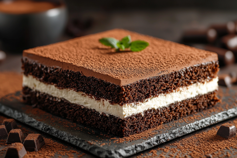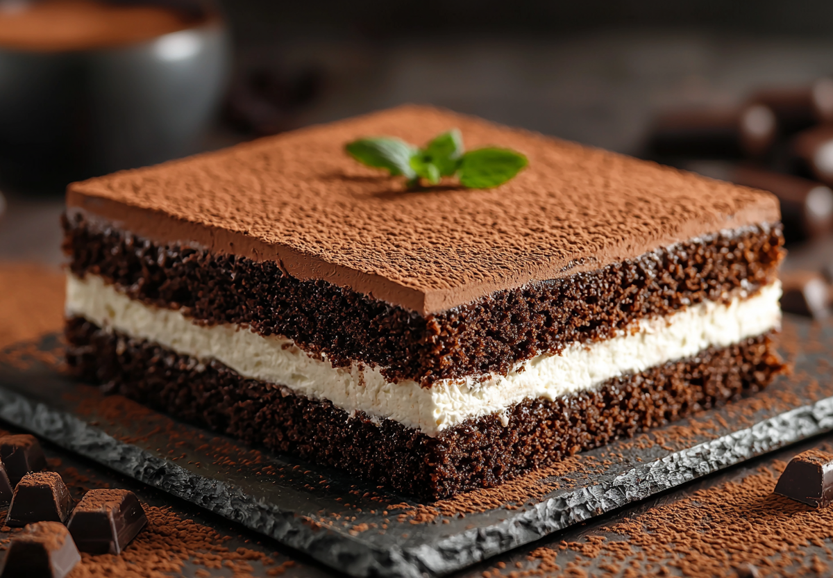 Рецепт: для бисквита взбейте 4 яйца с 150 г сахара, добавьте 150 г муки, 30 г какао и 1 ч. л. разрыхлителя. Выпекайте в форме при 180 °C 25–30 минут. Готовый остывший корж разрежьте вдоль на две пласта. Для творожной начинки 20 г желатина замочите в 100 мл молока, затем нагрейте до растворения. 500 г творога взбейте с 100 г сахарной пудры и ванилином, влейте желатин. Творожную массу выложите на нижний корж, накройте вторым и уберите в холодильник на 4-5 часов.