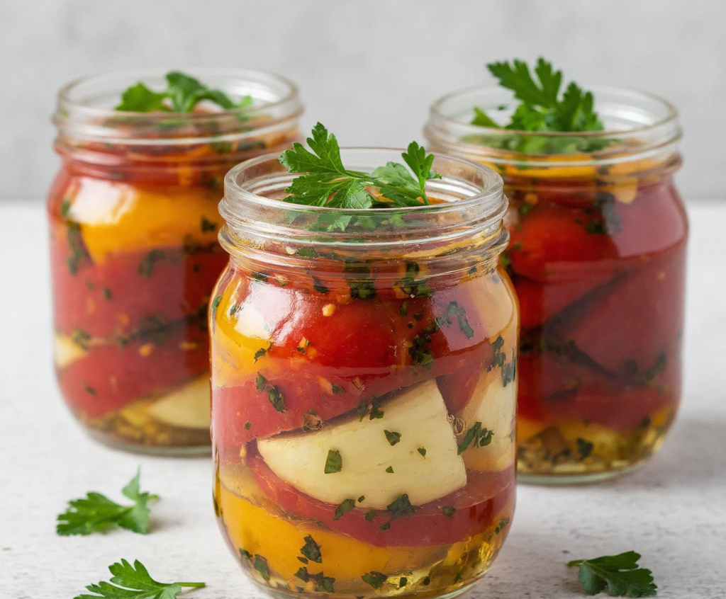 Беру сладкие перцы, чеснок и петрушку — и запекаю их в масле, получая универсальную закуску, которая хранится всю зиму в банках. Это гениально простое и невероятно вкусное блюдо, идеальное для мясных блюд, бутербродов или как самостоятельная закуска. Его необычность в том, что обычные перцы превращаются в нежные, ароматные ломтики, пропитанные чесночным маслом и зеленью, которые по вкусу напоминают солнечное лето даже в холодный январь. Получается обалденная вкуснятина: мягкие, сочные дольки перца с лёгким дымком, бархатистым чесночным ароматом и свежестью петрушки. Они отлично дополняют мясо, сыры, пасту или просто свежий хлеб.