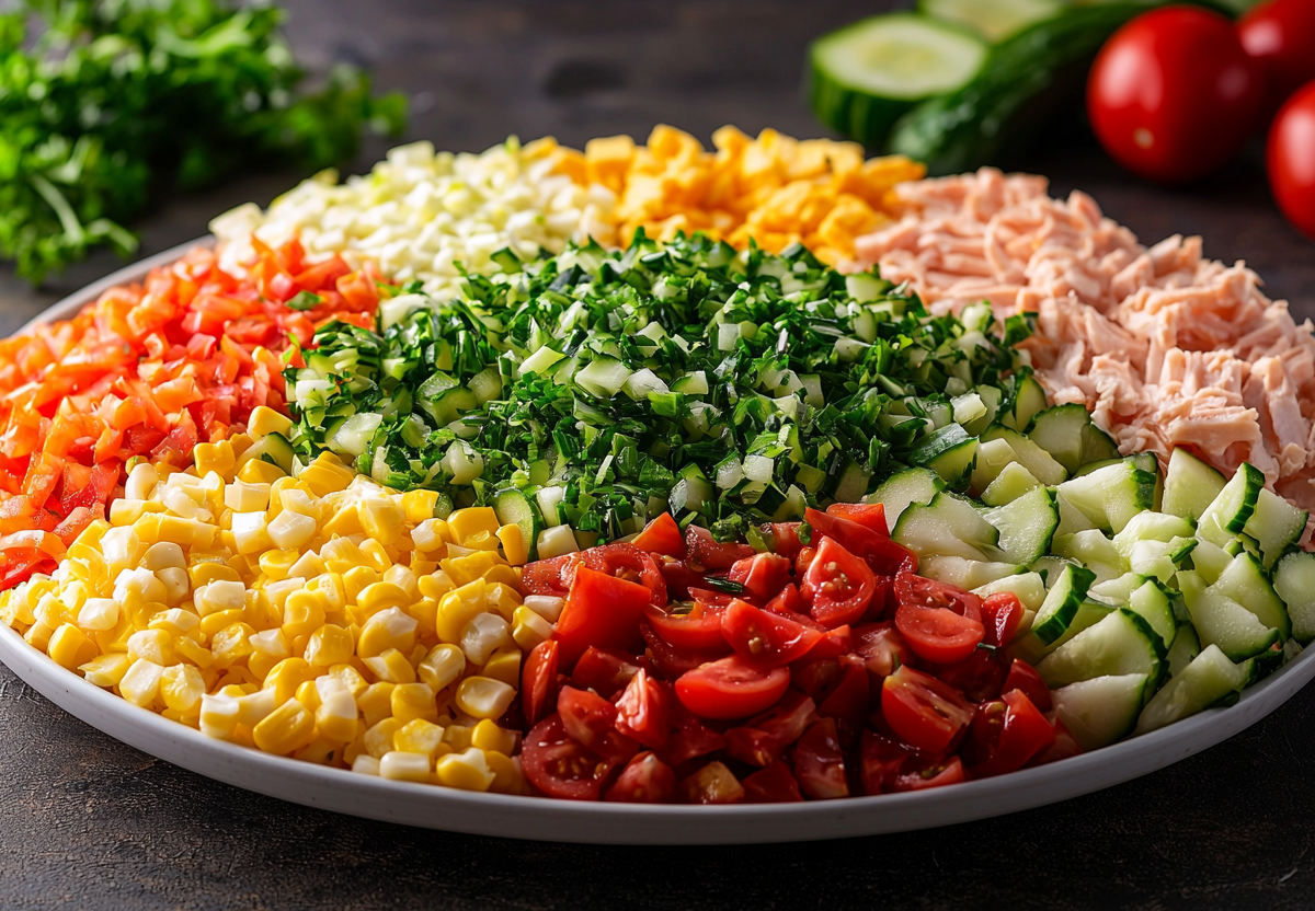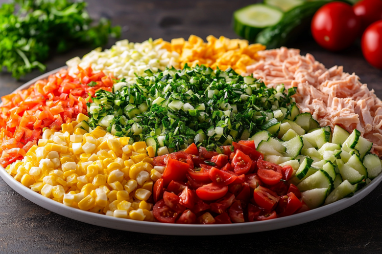 Полейте легким соусом, украсьте зеленью — и все, можно подавать! Этот салат не только эффектный, но и легкий: свежие овощи придают сочность, а копченая грудка добавляет насыщенный вкус без лишних калорий. Гости точно попросят добавки!