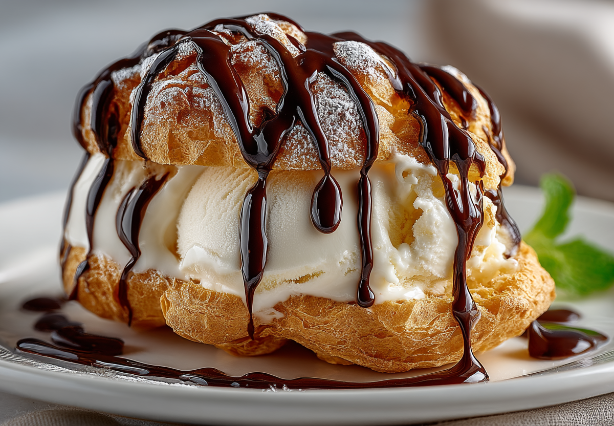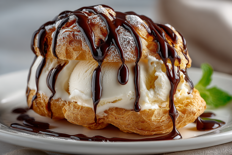 250 мл воды, 100 г сливочного масла, 150 г муки, 4 яйца, щепотка соли. Для соуса: 100 мл молока, 100 г темного шоколада, 20 г сливочного масла. 300–400 г ванильного мороженого.