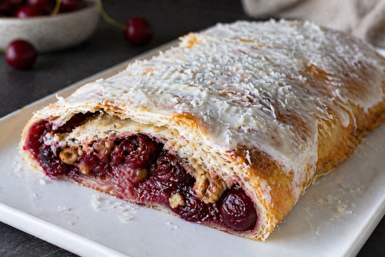 Когда хочется чего-то сладкого «как из пекарни», но без возни, просто беру лаваш и вишню. Делаю быстрый штрудель на раз-два. А сверху — быстрый слой из йогурта и кокоса, который делает десерт особенно нежным. В итоге получается сочный, ароматный штрудель с хрустящей корочкой и мягкой ягодной серединкой.