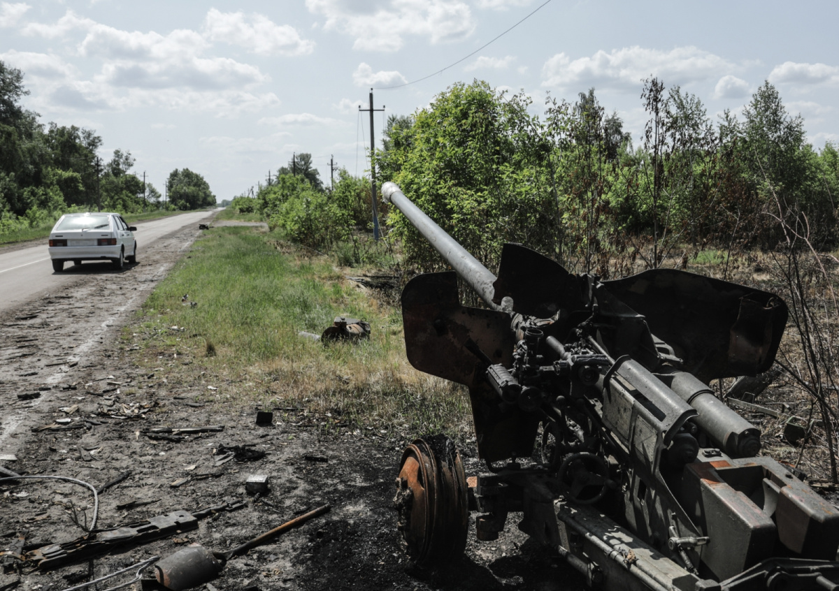 Мы заезжаем в село Козинка по Грайворонской трассе. На обочине лежит сгоревшая техника, срезанные провода и мины, застрявшие в асфальте, все это — последствия боев с диверсантами. Ближе к границе появляется надпись на стене, сделанная баллончиком: «ПРИВiТ З БАХМУТА!». Ее нарисовали солдаты «Русского добровольческого корпуса» (РДК, организация признана в РФ террористической, деятельность запрещена), которые в составе ДРГ проникли на территорию России. Отсюда до границы с Украиной 700 метров. После событий 22 мая по трассе почти никто не ездит — опасно.