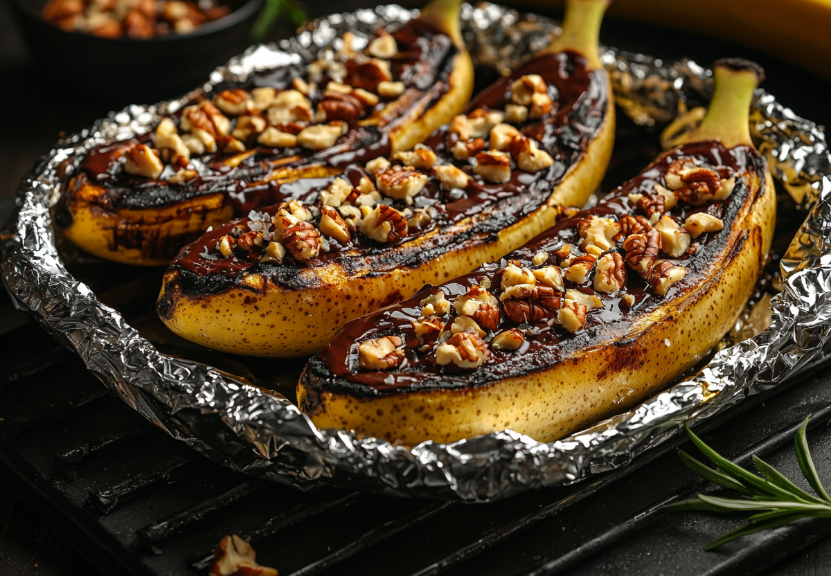 Берем спелые бананы, делаем надрез вдоль, не разрезая до конца. Внутрь кладем кусочки шоколада, орехи или печенье. Заворачиваем каждый банан в фольгу и отправляем на угли на 5–7 минут. Шоколад внутри расплавится, банан станет мягким, а аромат — просто невыносимо аппетитный. Главное — не передержать, чтобы начинка не вытекла.