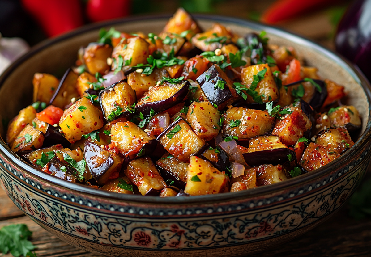 Жареные баклажаны по-восточному! Пикантная закуска с кисло-сладким маринадом. Эта яркая закуска сочетает нежность обжаренных баклажанов, хруст свежих овощей и насыщенный чесночный аромат. Идеальна к шашлыку или как самостоятельная закуска!