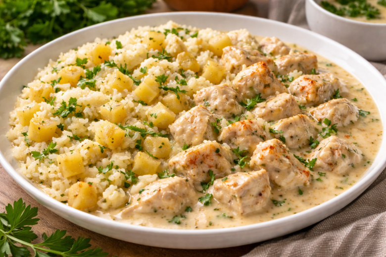 Подавайте гарнир, щедро поливая сливочной подливой с курицей — получается насыщенно, ароматно и совсем не банально.