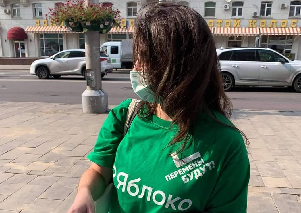 На снимке рядом с женщиной размещён плакат кандидата в депутаты от «Яблока» Александра Рябчука, в штабе которого она работает. Рядом с ней видна наклейка «Умного голосования».