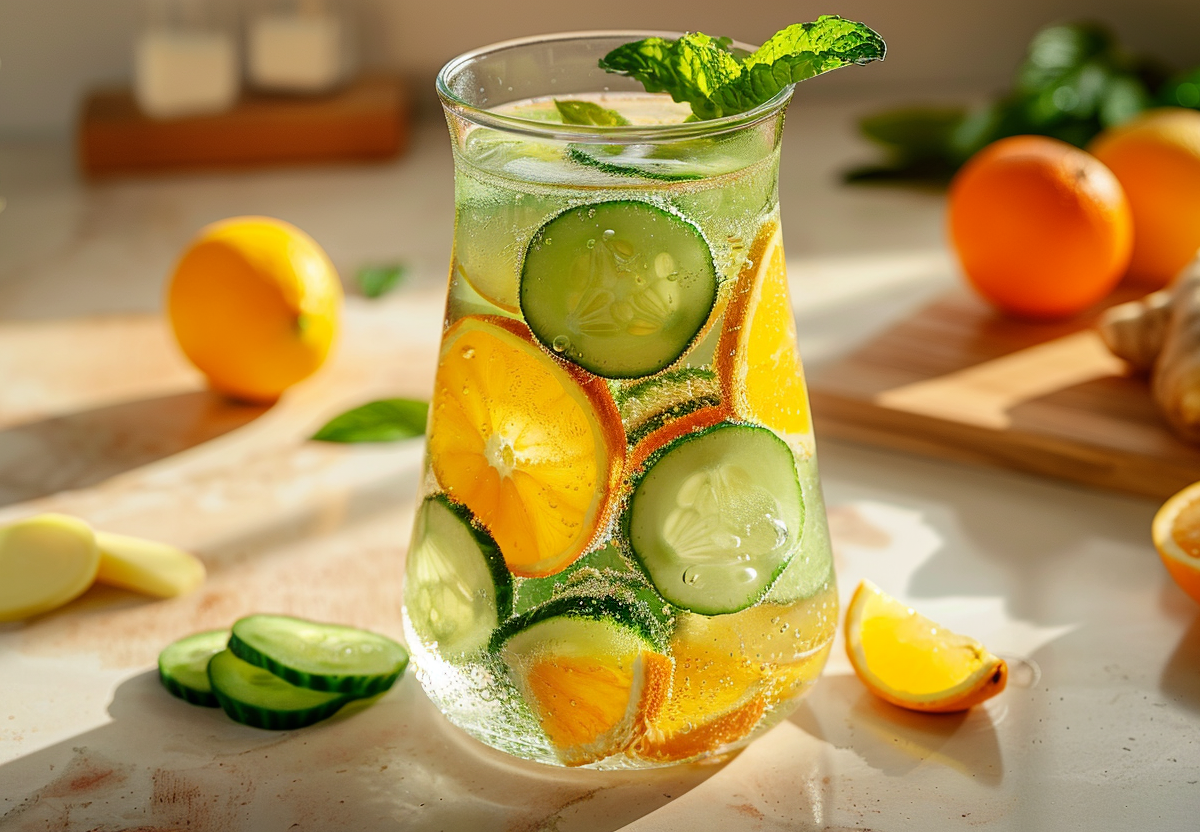 Этот напиток сочетает в себе пользу и свежесть цитрусовых, огурца и мяты. Всего час настаивания — и у вас готов натуральный энергетик без сахара и химии.
