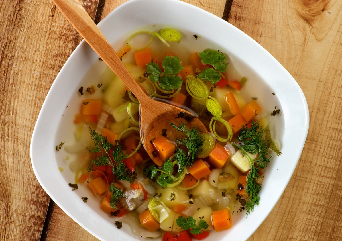 Готовим легкий суп с луком-пореем и болгарским перцем. Это блюдо поможет согреться и слегка утолить голод перед основным приемом пищи.
