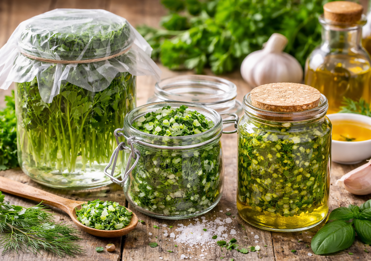 Для тех, кто любит насыщенный аромат, подойдет хранение в масле. Измельченную зелень заливают растительным или оливковым маслом и убирают в прохладное место. Этот способ не только сохраняет вкус и пользу, но и дает готовую ароматную заправку для кухни.