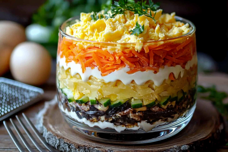 Для приготовления вам понадобится: 4 средние картофелины, 1 банка шпрот (200 г), 3 яйца, 1 луковица, 4 ст. л. майонеза и зелень для украшения. Картофель отварите в мундире, очистите и натрите на крупной терке. Яйца отварите и натрите на мелкой терке. Лук мелко нарежьте и обдайте кипятком, чтобы ушла горечь. На плоское блюдо выложите половину картофеля, слегка посолите и смажьте майонезом. Аккуратно разложите шпроты целиком. Следующим слоем идет лук, затем яйца с майонезом. Завершите оставшимся картофелем, снова смажьте майонезом. Украсьте зеленью и кусочками шпрот, создавая узор «под чешую». Обязательно дайте блюду пропитаться в холодильнике 2-3 часа — тогда все слои соединятся в единую композицию вкуса.