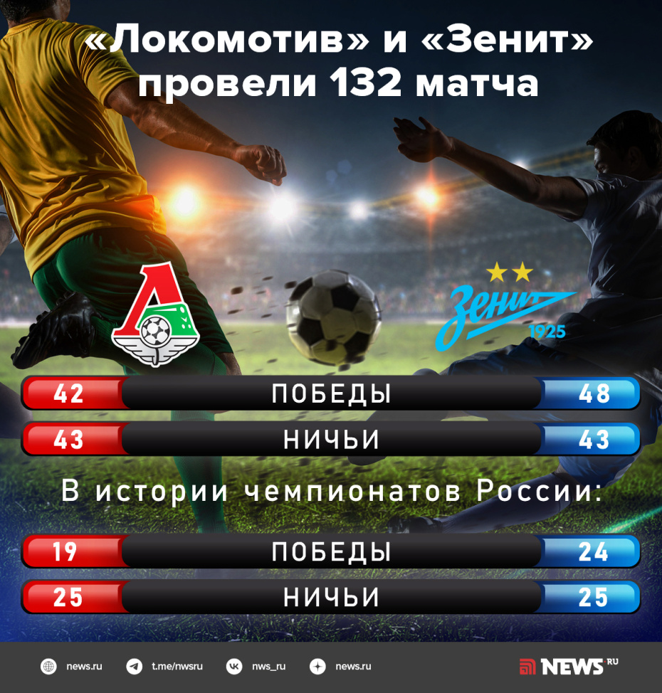 Матч между «Зенитом» и «Локомотивом» станет 133-м в истории противостояния клубов. Петербуржцы одержали 48 побед, 42 раза матчи остались за железнодорожниками, 43 раза была зафиксирована ничья.