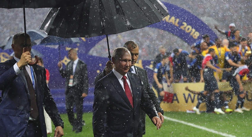 На заключительной церемонии награждения родился ещё один мем — про «зонт Путина». Во время вручения наград чемпионам начался проливной дождь, и только у секьюрити российского президента оказался зонт, который он оперативно раскрыл. Президенты Макрон и Грабар-Китанович мокли под дождём минут пять, пока организаторы исправляли недочёт.
