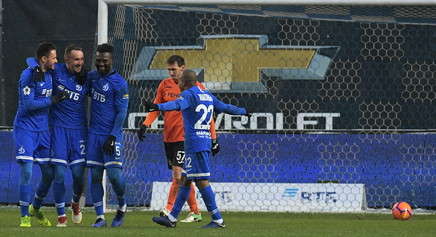 Второй слева - автор гола игрок ФК "Динамо" Алексей Козлов Второй слева - автор гола игрок ФК "Динамо" Алексей Козлов Фото: Владимир Федоренко/РИА Новости