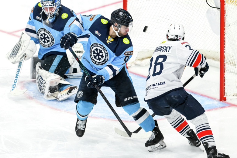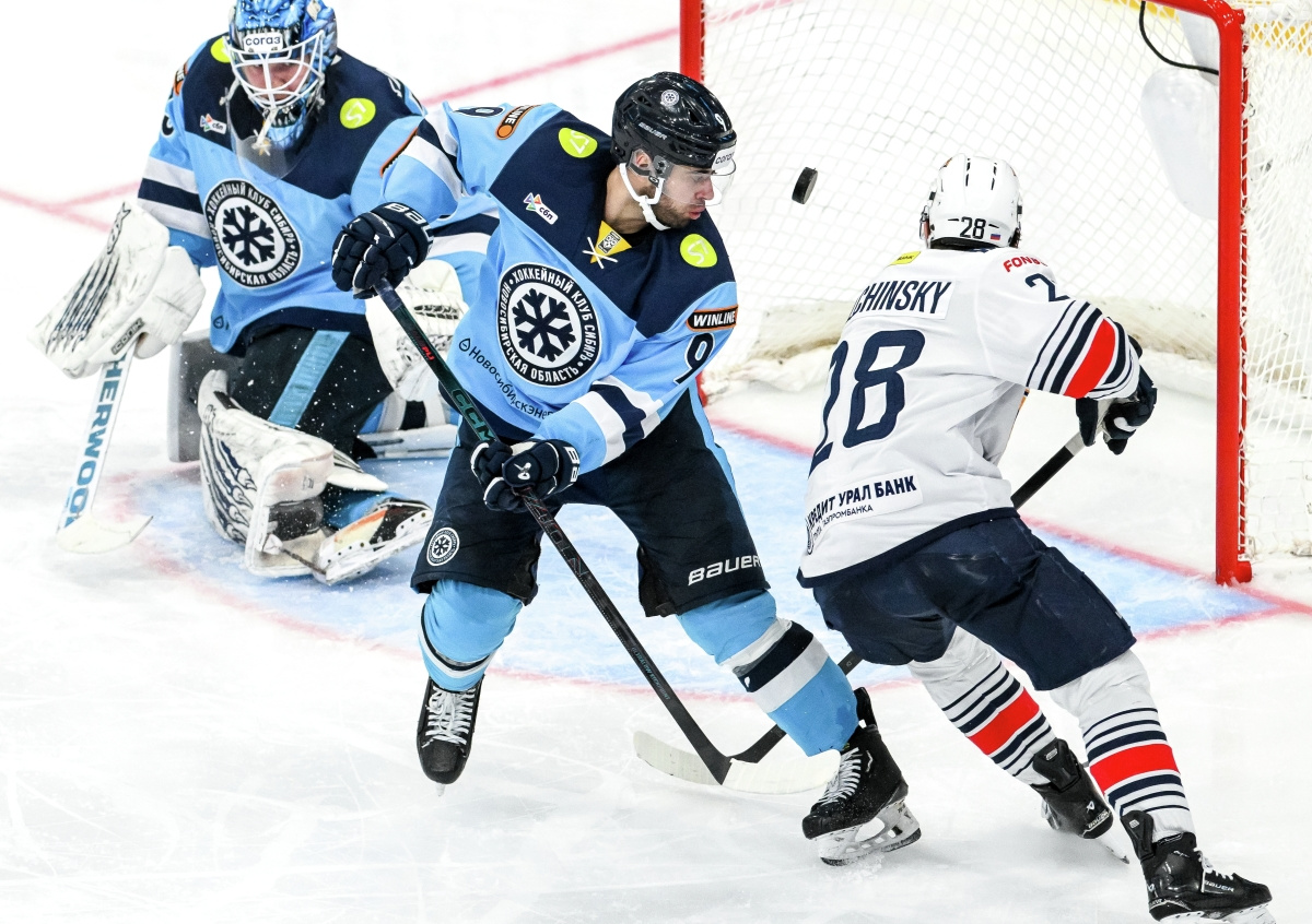 Вратарь Антон Красоткин (Сибирь), Егор Зайцев (Сибирь) и Сергей Толчинский (Металлург) Вратарь Антон Красоткин (Сибирь), Егор Зайцев (Сибирь) и Сергей Толчинский (Металлург) Фото: Александр Кряжев/РИА Новости