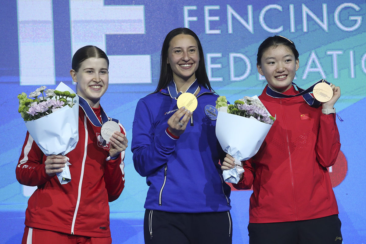 Слева направо: Зузанна Цесляр (Польша, серебро), Яна Егорян (Россия, золото) и Пань Цимяо (Китай, бронза) во время награждения победителей соревнований на саблях среди женщин на чемпионате мира по фехтованию Слева направо: Зузанна Цесляр (Польша, серебро), Яна Егорян (Россия, золото) и Пань Цимяо (Китай, бронза) во время награждения победителей соревнований на саблях среди женщин на чемпионате мира по фехтованию Фото: DAVID MDZINARISHVILI/EPA/TASS
