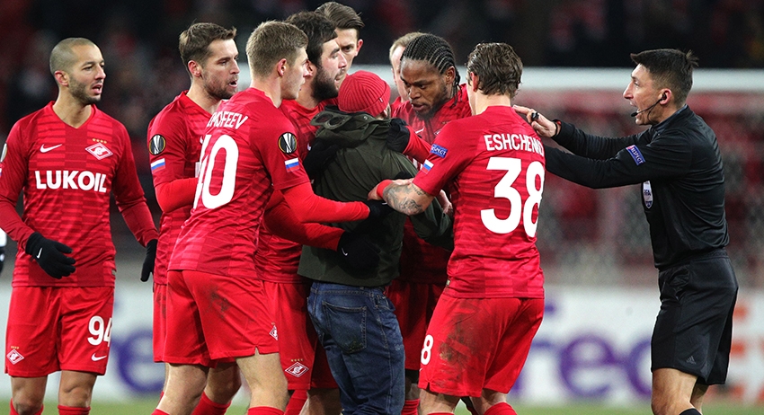Болельщик «Спартака» выбежал на поле во время матча 5-го тура группового раунда Лиги Европы против австрийского «Рапида». Инцидент случился на 70-й минуте игры. Фанат подбежал к капитану «красно-белых» Денису Глушакову и стал выяснять отношения.
