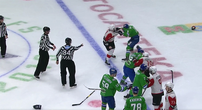 Хоккеисты омского «Авангарда» и уфимского «Салавата Юлаева» за доли секунды до финальной сирены подрались во время четвёртого матча полуфинальной серии КХЛ.