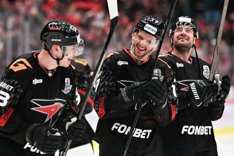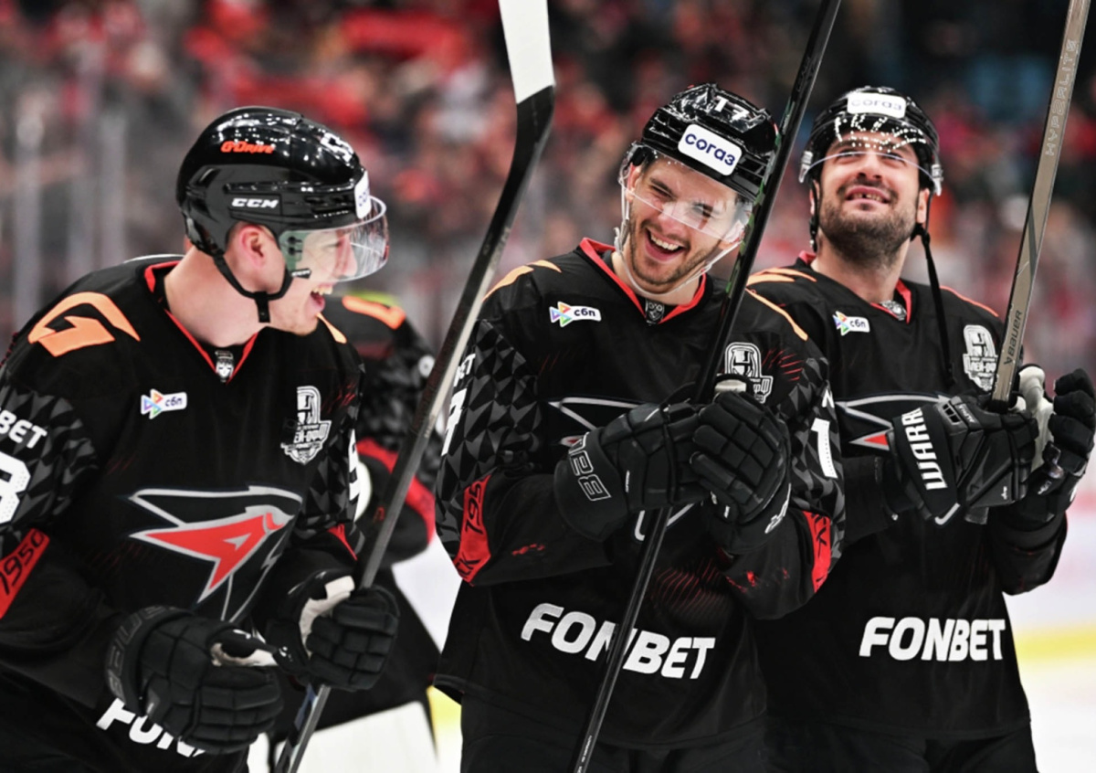 Егор Аланов («Сибирь»), автор гола Антон Косолапов («Сибирь») и Илья Люзенков («Сибирь») радуются забитой победной шайбе в овертайме матча плей-офф 1/8 финала Кубка Гагарина Континентальной хоккейной лиги в Новосибирске