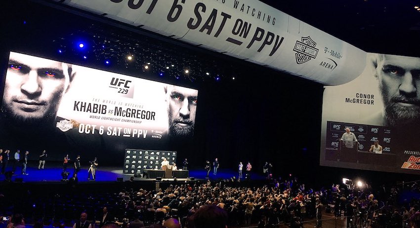 Некоторое время общаться с собравшимися пришлось президенту Ultimate Fighting Championship Дэйне Уайту. По его словам, Макгрегор может заработать за бой с Хабибом $100 млн. Позднее ирландец всё же появился в зале в приподнятом настроении и под аплодисменты зрителей. Конор традиционно сквернословил, отпускал унизительные колкости в адрес оппонента, назвав его «трусливой террористической крысой из Дагестана», и активно рекламировал виски собственного производства.