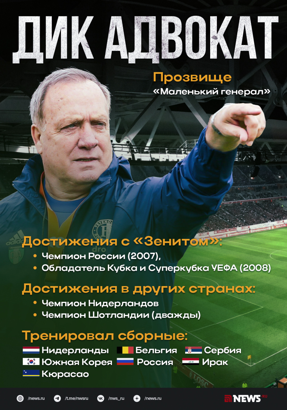 Нидерландский специалист Дик Адвокат завершил тренерскую карьеру в 78 лет. Почему он принял это решение, каких успехов добился в «Зените», как объяснил провал со сборной России на чемпионате Европы — 2012, кого вывел на мундиаль 2026 года — в материале NEWS.ru.