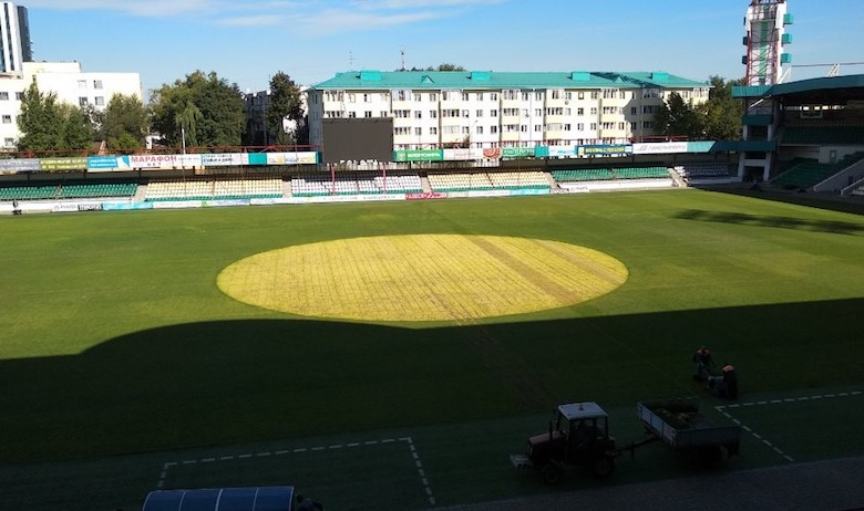Именно на таком поле местному клубу «Гомель» в рамках чемпионата Белоруссии пришлось принимать у себя соперников из команды «Гарадзея». К слову, хозяева выиграли со счётом 2:0. Тем временем в соцсетях уже стали появляться первые фотожабы на необычное пятно.