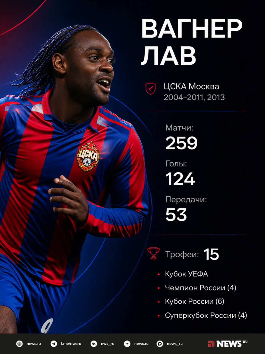 24 марта бразильский футболист Вагнер Лав объявил о завершении карьеры. Он считается одним из лучших легионеров в истории чемпионата России. Форвард провел за ЦСКА 259 матчей, забил 124 мяча и завоевал с командой множество титулов. Как бразилец, часто нарушая режим, стал звездой Российской премьер-лиги (РПЛ) — в материале NEWS.ru.