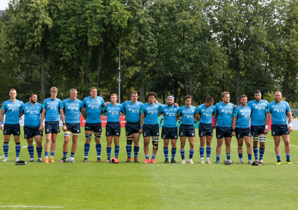 Команда «Динамо» перед началом пятого тура PARI чемпионата России по регби между командами «Слава» и «Динамо»