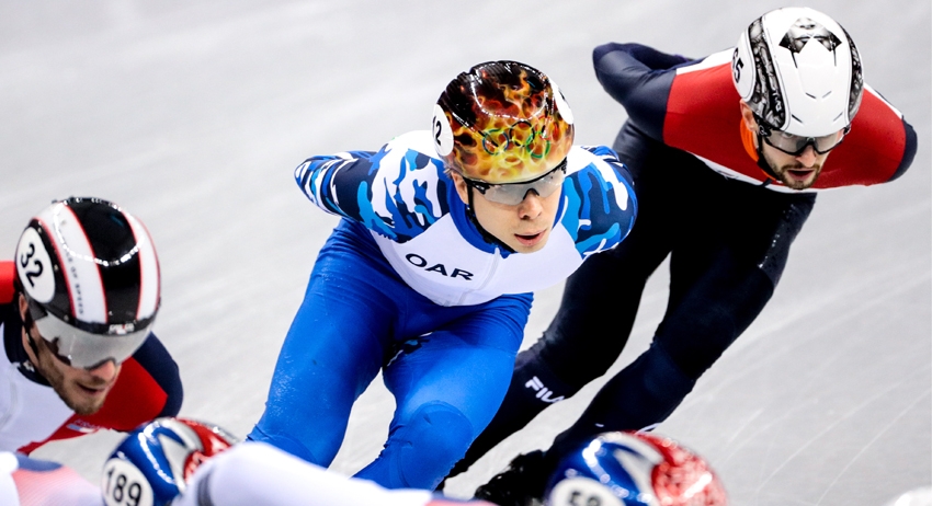 Южнокорейский спортсмен Лим Хе Джун, спортсмен из Нидерландов Шинки Кнегт и Олимпийский спортсмен из России Семен Елистратов (слева направо) на финише соревнований по шорт-треку на 1500 метров среди мужчин на XXIII зимних Олимпийских играх