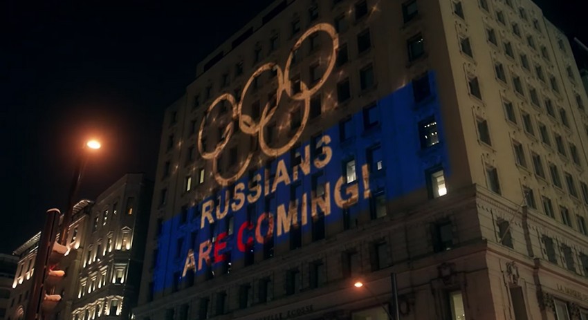 Россияне спроектировали на фасаде здания напротив световое сообщение: «Единственный допинг, который принимают наши спортсмены, — любовь и поддержка своего народа. Русские идут!»