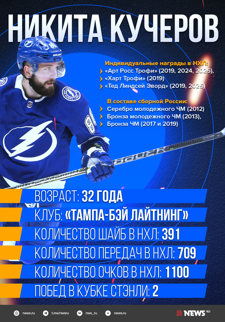 Российский форвард «Тампы-Бэй» Никита Кучеров сделал хет-трик в матче регулярного чемпионата Национальной хоккейной лиги (НХЛ) с «Сиэтлом» (6:2). Нападающий делит первое место с канадцем Коннором Макдэвидом в списке лучших бомбардиров. Сколько раз Кучеров выигрывал Кубок Стэнли, что известно о его личной жизни, как игру Никиты оценивает Александр Овечкин — в материале NEWS.ru.