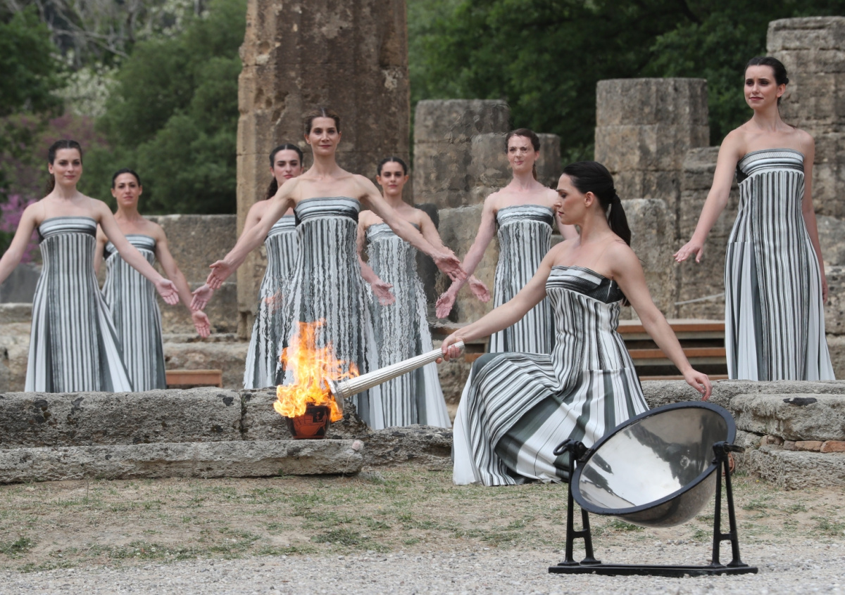 Согласно традиции огонь зажигают в древнем храме Геры от солнечных лучей, для этого применяется зеркало параболической формы. Однако в Древней Олимпии стоит облачная погода, поэтому огонь зажгли от пламени, которое получили от лучей солнца в ходе генеральной репетиции церемонии, состоявшейся накануне.