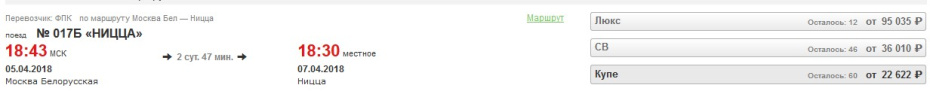 Стоимость же поездки от Москвы до Сан-Ремо обойдётся от 21 тыс. рублей в купе, в люксе — от 32 тыс. До Ниццы из столицы России (мы забили случайную дату в поиске РЖД, 5 апреля) вам придётся выложить от 22 тыс. рублей.