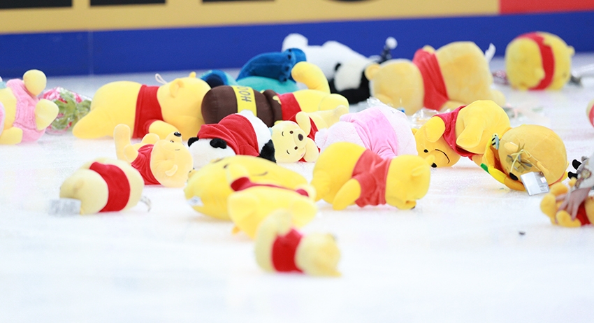 Таким образом, Ханю побил не только мировой рекорд в короткой программе, но и обогнал себя же по количеству собранных плюшевых мишек — в прошлом году японцу подарили 11 мешков мультяшного любителя мёда. Тогда волонтёры собирали «виннипуховые осадки» со льда в течение 5 минут.