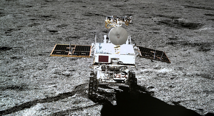 Китайский луноход «Юйту-2» («Нефритовый заяц») борется с особенностями рельефа спутника Земли. Поверхность вокруг аппарата покрыта многочисленными кратерами.